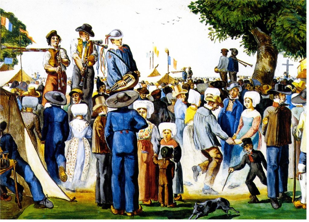 Lorsqu’on parle de « bourrée », on pense souvent Auvergne. Cette danse est perçue comme originaire de cette région depuis le XVIIe siecle, bien que cela n’en soit pas certain. Cette danse a des origines dans le centre de la France au sens très large, Auvergne, Berry, Limousin, Morvan,… Le nom de bourrée provient des fagots de petit bois qui alimentaient le feu autour duquel la danse était pratiquée. Elle fût très à la mode sous Louis XIV. George Sand, qui aimait à danser la bourrée du Berry la caractérise dans ses écrits comme « notre danse classique, souple, bien rythmée et très gracieuse dans sa simplicité ».Dans « Le meunier d’Angibault », elle décrit les Berriauds dansant la bourrée : »Aucun peuple ne danse avec plus de gravité et de passion en même temps. A les voir avancer et reculer à la bourrée, si mollement et si régulièrement que leurs quadrilles serrées ressemblent au balancier d’une horloge, on ne devinerait guère le plaisir que leur procure cet exercice monotone, et on soupçonnerait encore moins la difficulté de saisir ce rhythme élémentaire que chaque pas et chaque attitude du corps doivent marquer avec une précision rigoureuse, tandis qu’une grande sobriété de mouvements et une langueur apparente doivent, pour atteindre à la perfection, en dissimuler entièrement le travail. Mais quand on a passé quelque temps à les examiner, on s’étonne de leur infatigable ténacité, on apprécie l’espèce de grâce molle et naïve qui les préserve de la lassitude, et, pour peu qu’on observe les mêmes personnages dansant dix ou douze heures de suite sans courbature, on peut croire qu’ils ont été piqués de la tarentule, ou constater qu’ils aiment la danse avec fureur. De temps en temps la joie intérieure des jeunes gens se trahit par un cri particulier qu’ils exhalent sans que leur physionomie perde son imperturbable sérieux, et, par moments, en frappant du pied avec force, ils bondissent comme des taureaux pour retomber avec une souplesse nonchalante et reprendre leur balancement flegmatique. Le caractère berrichon est tout entier dans cette danse. Quant aux femmes, elles doivent invariablement glisser terre à terre en rasant le sol, ce qui exige plus de légèreté qu’on ne pense, et leurs grâces sont d’une chasteté rigide. ».De nombreux compositeurs comme Bach, Mozart, Lully….en ont inscrit à leur répertoire.